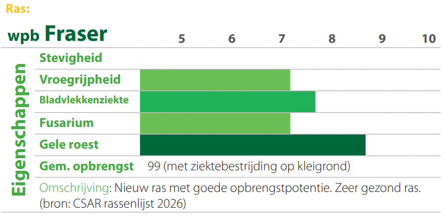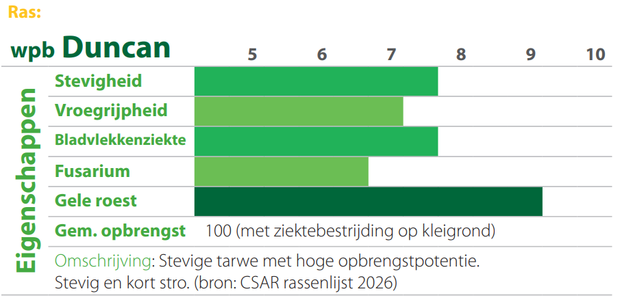 Voor dit seizoen bevelen wij de rassen WPB Duncan en WPB Fraser aan. Deze rassen zijn geschikt voor ons teeltgebied. De stevigheid en opbrengst van de Duncan komt goed uit de CSAR rassenlijst. Daarnaast heeft de Duncan een zeer goede score op gele roest. De Fraser heeft een goede opbrengstpotentie en scoort zeer goed op roest.