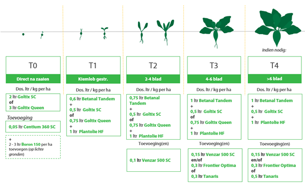 Rechts het onkruidbestrijdingsschema voor de bieten.